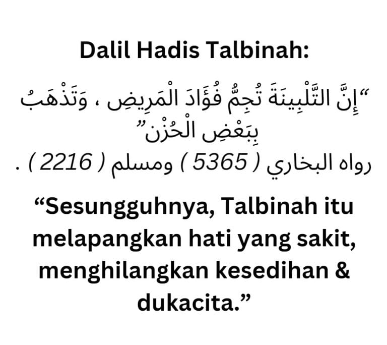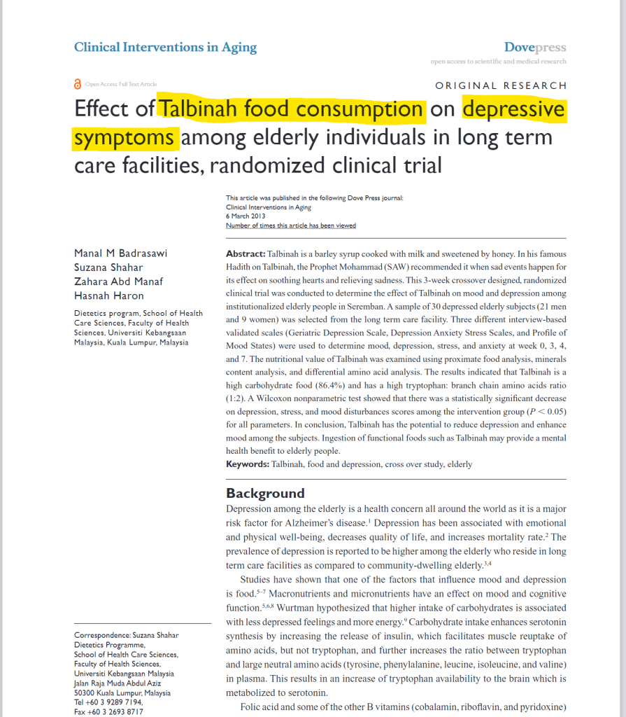 Bukan sahaja Dari Hadis, Talbinah juga telah dibuktikan secara saintifik!Kajian Dari Saintis UKM menunjukkan dengan mengamalkan Talbiah selama 3 minggu, dapat menurunkan skor kemurungan.